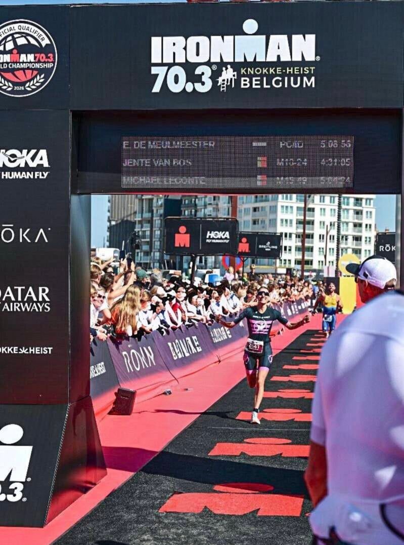 De wekker ging vroeg,05:00 om precies te zijn want de bus ging om 05:45 (Amai wat vroeg!😋) en ohh ik was zó zenuwachtig dat is niet normaal! Een uur voor de start was ik nog aan het overgeven van de stress want ik wist wat er op het spel stond..maar eenmaal in het water was alles weg.Zwemmen ging goed! Met een gemiddelde van 1"39 kwam ik binnen 31 minuten het water uit,en hup door naar het fietsen.In het begin ging het niet zo lekker, kwam er maar niet goed in tot zo'n 13km..vanaf toen was het boven de 30km per uur gemiddeld waardoor ik lekker door kon fietsen en mijn achterstand kon inhalen.Met opnieuw een pr, namelijk na 2:53:46 kwam ik terug de wisselzone in.Ik hoorde mama zeggen "als je zo door gaat eindig je onder de 5 uur! Maar blijf onder die 4"30,dan heb je een pr!".Dus ik zette alles op alles..ik wist dat ik het kon, dat het haalbaar moest zijn..we moesten 3 hele rondes tot we de finish over mochten en na de eerste ronde zag ik de eerste dame finishen uit mijn agegroup binnen een tijd van 04:40 en ik dacht 'waauwww als ik nu nog meer ga gassen is het misschien toch haalbaar' (wilde enorm graag 05:15 lopen, maar dacht dat dat niet haalbaar was).De laatste twee waren pittig met de warmte en verzuurde benen maar ik bleef gaan..na 3 rondes mocht ik dan toch écht die rode loper op,en wauw wat ik toen zag!! Toen ik op de finish boog mijn naam zag staan met de tijd 05:08:56,wat uiteindelijk volgends de chip 05:09:06 was wist ik het allemaal even niet meer..zoveel emoties want, wat ik nog niet tegen de wereld mocht zeggen was ..als ik onder de tijd 05:26 zou finishen, ik een wereld record op de Ironman70.3 in mijn categorie (sporters met verstandelijke beperking) zou neerzetten, en ik wist ook..als ik die neerzet mag ik naar Orlando voor een tweeweekse trainingsstage. Dus toen ook nog bij de prijs uitreiking werd omgeroepen het wereldrecord te hebben verbeterd kwamen mijn dromen uit..i did it! Goud en een wereldrecord op mijn naam!🥳